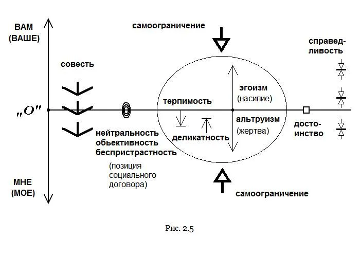 Черта также символизирует идеальный договор. Чтобы увидеть его, вообразите насилие от человека в виде стрелок вверх от черты (А), а к человеку – вниз (Б). Пусть длина стрелок отражает силу воздействия. Человек обычно сопротивляется внешнему насилию, однако силы его не бесконечны. Маленькие стрелки Б он может победить легко, а крупные – вряд ли. На такое способны только герои. Стрелки А тоже встречают сопротивление и, что очевидно, сильные люди не только хорошо отражают стрелки Б, но и могут производить большие стрелки А.