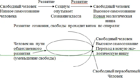 Поясним это. Мы уже определили, что мир, обладающий сознанием, создаёт более сложную упорядоченность на основе упорядоченности более простой. На этом основан наш мир – на постоянном развитии и усложнение закономерностей, действующих в нем, на созидании все более сложного и разветвленного порядка. Человек, являясь частью Бога, творит более сложную упорядоченность, используя энергию, высвобождающуюся из разрушения более простых упорядоченностей, и является элементом Бога. Человек и Бог движутся в одном направлении(13,с.51). Мысли человека, свободного человека, являются мыслями Бога и встречают наименьшее сопротивление в направлении движения сознания Бога. В идеале, когда человек полностью вступит в новую экологическую нишу, сознание человека станет равносильно сознанию Бога.