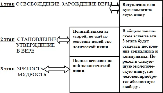 Этап зрелость, мудрость будет означать, что человек полностью освоил новую экологическую нишу и готов преодолеть барьер человеческого тела, т. е. обрести абсолютную свободу. Приобретение абсолютной свободы будет означать переход в новую экологическую нишу – нишу Царства Божия на Земле. Историческое развитие 3 этапов будет означать осознанное стремление человека к свободе от относительной свободы к абсолютной свободе.