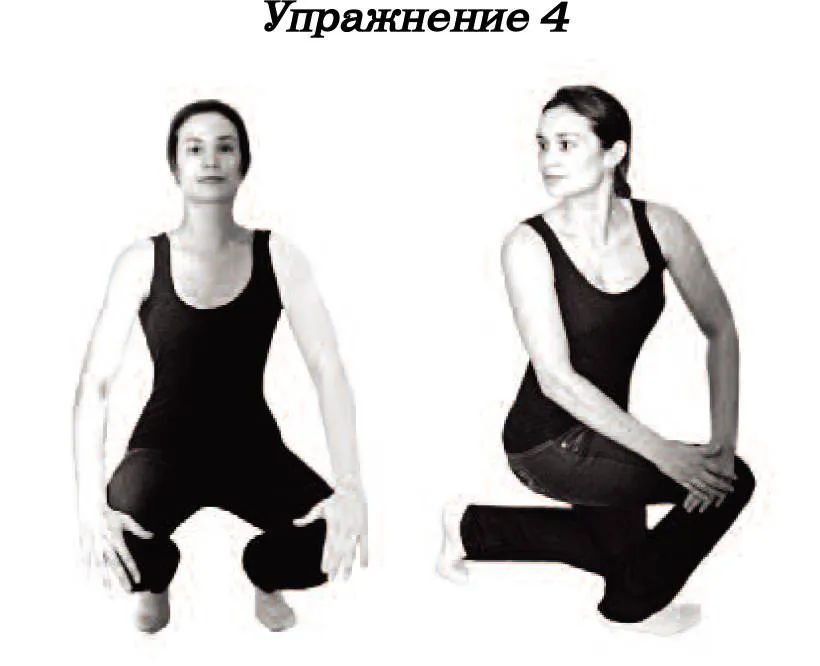 Исходное положение: сесть на корточки; а) ступни расставлены примерно на 30 см, причём пятки помещают у внешних сторон бёдер, а не под тазом, кисти лежат на коленях, которые расставлены приблизительно на 30 см;