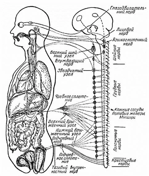 Анатомически симпатическая нервная система состоит из двух гирлянд нервов (пограничных стволов), похожих на лозы вьющегося винограда, спускающиеся вниз по обращённой внутрь тела части позвоночника на уровне его грудного и поясничного отделов. Они образованы отростками, выходящими из нервов спинного мозга. От этих гирлянд нервы направляются к симпатическим узлам и иннервируемым органам. Имеются 24 пары симпатических узлов: 3 шейных, 12 грудных, 5 поясничных, 4 крестцовых. Так, из верхнего шейного симпатического узла формируется сплетение сонной артерии, из нижнего. Верхний сердечный нерв, образующий симпатическое сплетение в сердце (оно служит для проведения ускорительных импульсов к мио-карду). От грудных узлов иннервируются аорта, легкие, бронхи, органы брюшной полости, от поясничных – органы малого таза. Симпатическая часть возбуждается адреналином, тормозящее влияние оказывает эрготамин.