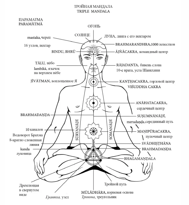Следует отметить, что это состояние возвращения является более обогащенным и насыщенным по сравнению с состоянием в исходной точке отправления. Вернувшись, Кундалини уже несет в себе весь мир. Для того чтобы Шива проявился как Парамашива – Абсолютное Все – пребывающее за пределами имманентности и трансцендентности, Кундалини должна проявиться из самого Шивы и возвратиться к Нему же. (В христианской теологии имманентность определяется как неотделимость Бога от сотворенного им мира. По другой теории, Бог отделен от мира и принципиально непознаваем, т. е. трансцендентен. – Прим. пер.).