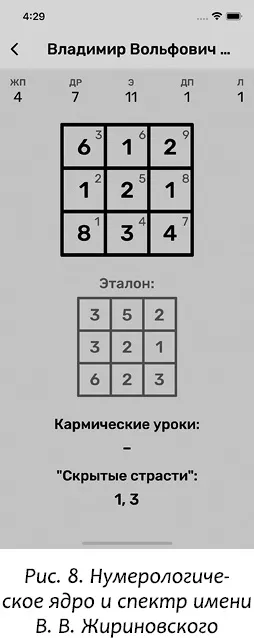 Еще один пример: Николай Николаевич Добронравов, родился 22 ноября 1928 года (рис. 9). В спектре его имени Единица и Семерка одинаково сильны. Какому из этих чисел мы отдадим предпочтение? Я думаю, вы согласитесь, что Семерка важнее, ведь она встречается реже, чем Единица. При этом она не имеет выхода в нумерологическое ядро. Тройка тоже выражена неплохо и является Числом Личности. Неудивительно, мы имеем дело с поэтом. А как в судьбе Добронравова проявляет себя Семерка? Я не знаю. Я прочел его краткую биографию в «Википедии» и не получил ни малейшего намека на Семерку, кроме, пожалуй, того, что он вырос во время войны в детском доме. Мне кажется, это хороший пример того, как сильно выраженное в нумерологическом спектре число может на самом деле быть совершенно не очевидным при поверхностном взгляде на человека.