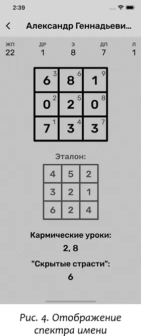 В верхней части экрана для удобства отображены элементы нумерологического ядра. Затем следует собственно спектр имени. Как вы видите, это матрица 3 на 3 ячейки, и каждая ячейка в правом верхнем углу помечена числом, к которому она относится. Мы видим, что у меня много Единиц, нет Двоек, много Троек и так далее. Здесь важнее всего отметить, насколько параметры нумерологического ядра отражены в спектре имени.