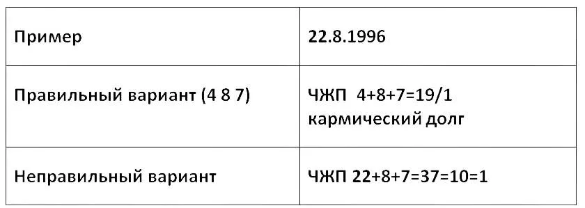 Как видите, для даты 29.1.1982 в неправильном варианте расчета появилось число кармического долга 14.