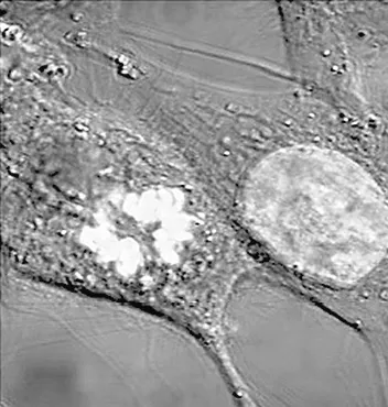 Рис. 10. Клетки HeLa (см. рис. 2 на цветной вклейке). Клетка справа находится в интерфазе – у нее окрашено все ядро. Левая клетка претерпевает митоз, поэтому ДНК конденсирована и окрашено не все ядро