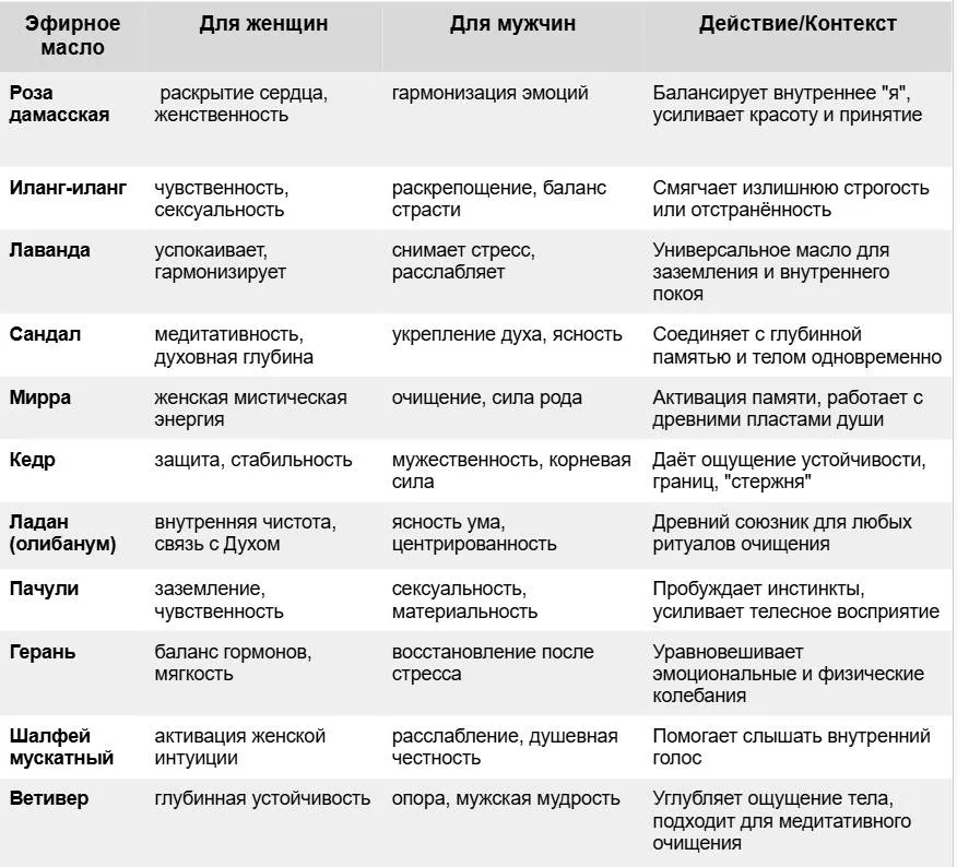 Таблица эфирных масел для ухода за телом