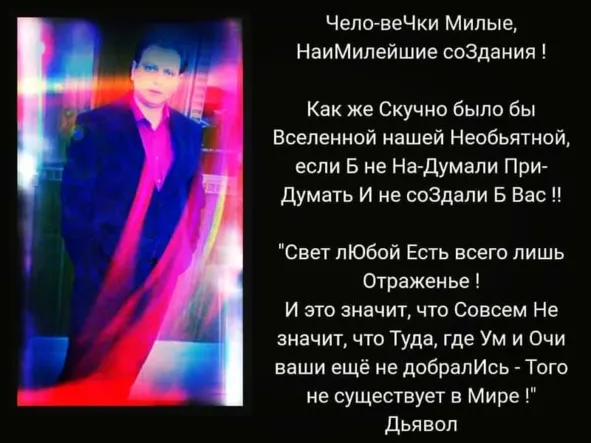 Истинной целью моих книг – «Пианист в Стране Чудес», «Курятник челОвечий» и «Воспоминания Дьявола», некоторые Главы из которых вошли в этот сборник «Избранное» – является декодирование нейролингвистического программирования у моих читателей от социума и религий разных всяких, которое вначале даст трещину, а потом исчезнет насовсем, когда вновь выработается привычка ДУМАТЬ САМОМУ.