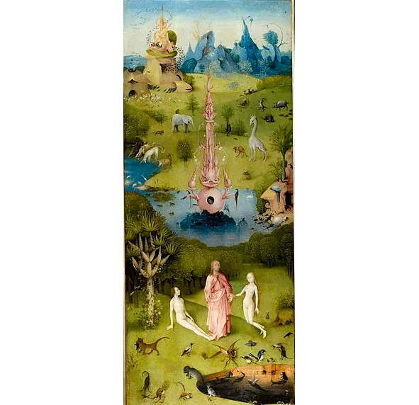 Возьмем Адама и Еву на левой створке в «Саде наслаждений». Сотворение человека происходит под каучуковым деревом. Но при этом, он изображает вьюнок на каучуковом дереве. А животные? Вы знаете, в той же самой створке Адама и Евы динозавры бегают. Посмотрите, наверху бегают динозавры. Кабаны. Белые медведи. Верблюды. Сколько пород лошадей?