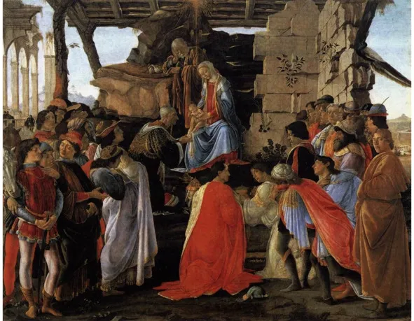 И хотелось бы сделать последнее замечание, очень и очень важное, а для меня интересное. Оно касается того, что на протяжении XV века или кватроченто, во Флоренции, тема «Поклонения волхвов» была написана бессчетное количество раз. Просто уверяю вас – не было ни художника, ни скульптора, никого другого, кто не писал бы на эту тему. Эта тема бесконечна и продолжается до сих пор. Она о том, как Каспар, Мельхиор и Валтасар – три великих волхва, пришли в ясли и принесли дары младенцу. Но художники, пишущий этот сюжет во Флоренции XV века, изображают не ясли, а какое-то общественное место.