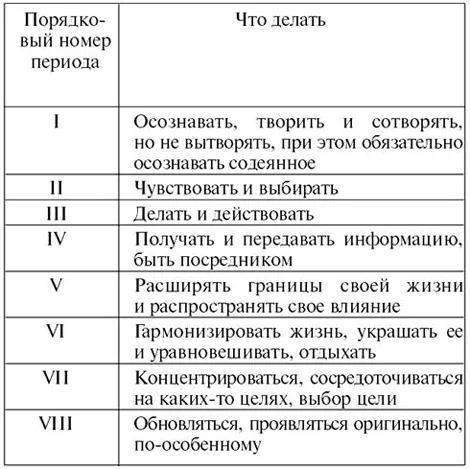 Ответ на вопрос «Что делать?» может быть сформулирован в восьми вариантах, зависящих от порядкового номера периода круга жизни, представленных в табл.1.