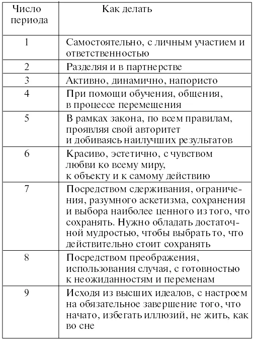 Ответ на вопрос «Как делать?» можно дать в девяти вариантах в зависимости от числа соответствующего периода. Так, можно что-то делать самостоятельно или в партнерстве, активно или концентрируясь на чем-то, или гармонизируя что-то и т. п. Эти варианты приведены в табл. 2.
