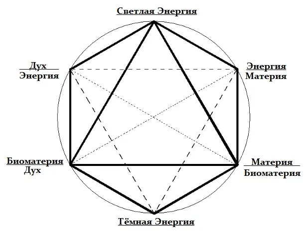 Вот, что у нас получилось. Те символы, которые вы здесь «узреете», мной нарисованы не специально. «Светлая Энергия» – аналог интеллектуальной преобразующей составляющей. «Тёмная Энергия» – аналог мощной преобразуемой энергии. Названия эти дал, лишь по тому, что они на слуху, но они не связаны с определениями принятыми в астрофизике. Вот такой «Вселенский Октаэдр», по-моему, и является условной схемой мироздания. Конечно, всё это не однозначно и может вызвать массу справедливых возражений, но это попытка хоть как-то представить схему взаимодействий элементов Вселенной. Какие выводы можно сделать из этой схемы? Самое важное для меня, что смерть тела это не смерть Духа. Жизнь продолжается! Во Вселенной, смерти и разрушения вообще нет. Смерть и разрушение, существуют только в сознании людей, а значит и в их делах. Есть только переход из одного состояния в другое. «Всё течёт, всё изменяется». Энергия преобразовывается в материю. Материя в жизнь. Жизнь в Дух. Вспомните закон сохранения энергии, он действует везде и всюду. И снова ничего нового. Единственно, что хотелось бы добавить, это объяснить, почему я уверен в переходах, ведь это не всегда очевидно. Сейчас, по-моему, никто не спорит, что энергия является главной движущей силой вселенной. Вот на основе этого и попробую объяснить свои представления о переходах.