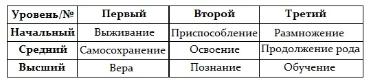 Первый, Второй и Третий, это распределение по порядку «включения» (активизации) инстинктов, от рождения. При ужесточении жизненных условий, они «отключаются» в обратном порядке. Начальный уровень, свойственен всем живым организмам. Высшего уровня, может достигнуть только человек. Уровни можно ещё назвать и так: Базовый или Физический уровень, Переходный или Интеллектуальный уровень и Интеграционный или Духовный уровень, соответственно. Отсюда вывод, чем выше организация существа, тем выше уровень развития Инстинктов. Следовательно, для нормального развития, человеку необходимы условия для нормального формирования и развития биоинстинктов. Получается, что инстинктам не надо подчиняться или сопротивляться, а нужно правильно ими пользоваться.
