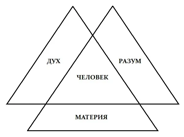 Не напоминает ли вам это, что ни будь? Атеисты «ловили» христиан на логическом противоречии: «Единый Бог и Троица». С одной стороны Бог один, с другой стороны он тройственен. Если же провести аналогию, то получится, что Дух – Святой Дух, Разум – Бог (Творец, Создатель), Тело (Материя) – Христос (Сын Человеческий). Так нам опять встретилась схема с уже известными понятиями.