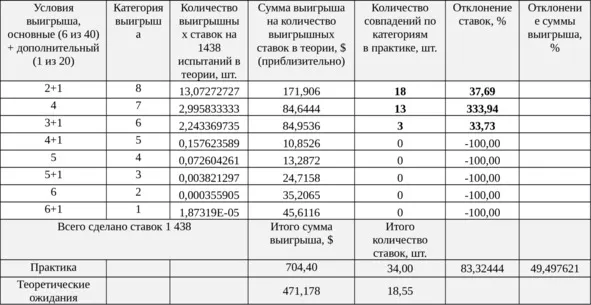 Но самым главным в этой части книги является то, что данным, приведённым в таблицах 5, 6 и 7, можно доверять. Все ставки были зарегистрированы в личном кабинете. Все они были сделаны как минимум за час до тиража. После розыгрыша все сыгравшие ставки остаются в истории, и удалить их оттуда никак нельзя. Таким образом, я не мог подогнать эти результаты или хоть как-то «смухлевать». При желании их легко можно подтвердить. Любой заинтересованный человек сможет их пересчитать, пересмотреть, скопировать и выдвинуть свою теорию того, как это получилось.