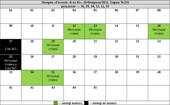 Тогда я стал больше внимания уделять самим сновидениям, но практику осознанных снов не бросил. В одном из февральских сновидений вижу я, как яхта с номером 17 обгоняет яхту с номером 25 (знаковый сон №3). И я, чтобы не повторить участь предыдущего тиража, в своей несущей ставке использую два числа – 17 и 25. А 16 февраля состоялся тираж №231 с результатом 16, 19, 34, 13, 12, 35 (таблица 2). В итоге, вместо того чтобы выиграть приз второй категории, выигрываю приз третий категории, и опять довольно крупная сумма обошла меня стороной. И я опять начал кусать себе локти. Тогда я подумал для себя, что, возможно, так как яхты я видел в полудрёме, то это было не сновидение, а фантазия, поэтому и не получилось.
