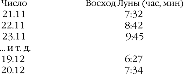 Рассчитаем дни месяца. 1-й лунный день длится с 00 час.19 мин (момент новолуния) до 7 час 32 мин (восход Луны) 21 ноября; 2-й лунный день – с 7 час 32 мин 21.11 до 8 час 42 мин 22.11; 3-й лунный день – с 8 час 42 мин 22.11 до 9 час 45 мин 23.11 и так далее.