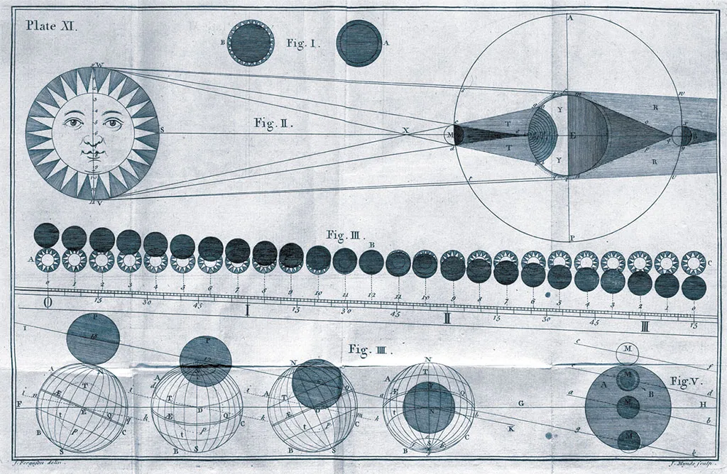Гравюра Джеймса Мунди по рисунку Джеймса Фергюсона. Опубликована в трактате шотландского астронома Джеймса Фергюсона «Астрономия, объясненная на основе принципов сэра Исаака Ньютона». 1756. Астрономическая таблица наглядно показывает солнечное и лунное затмения