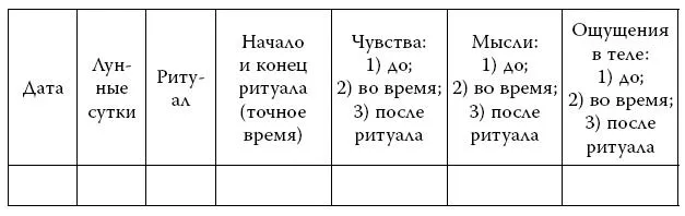 Все эти тридцать дней, пока ты будешь учиться лунной магии, я советую тебе вести дневник. Это очень мощный магический инструмент, который станет твоим помощником и талисманом на всю жизнь. В этом дневнике нужно записывать, какие ритуалы ты совершила, свои чувства и мысли до, после и во время магической практики. Есть два способа ведения дневника: свободный и в виде таблицы.