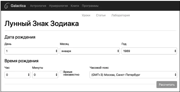 Рис. 3. Программа для определения лунного знака зодиака на сайте Galactica