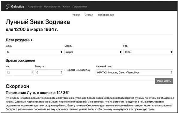 Рис. 4. Результат вычисления лунного знака зодиака для Михаила Жванецкого