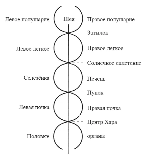 Прямая в середине – это позвоночный столб, в основании которого, как говорят Посвященные Индии, дремлет сила Кундалини, которая должна быть пробуждена. Выходя из чакры Муладхара, сила Кундалини поднимается по центральному каналу позвоночного столба, называемому Сушумна; она активизируется благодаря дыханию двумя потоками Ида и Пингала, расположенными по обе стороны Сушумны, и поднимается до тысячелепесткового лотоса, чакры Сахасрара.