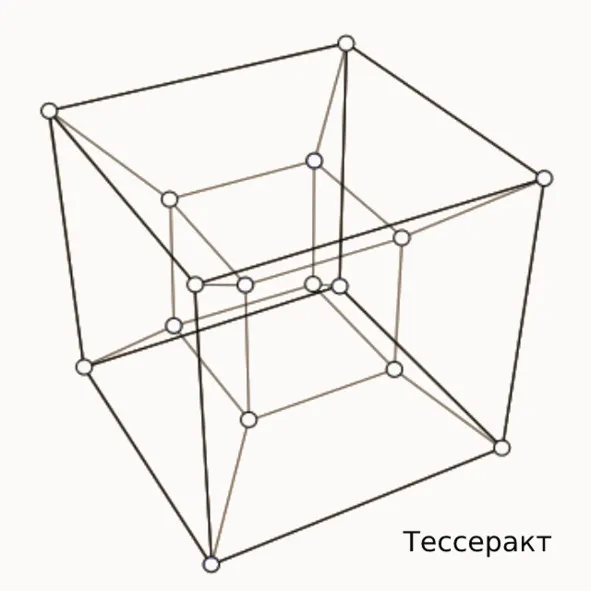 Куб, как и квадрат, никогда не бывает сам по себе. Он всегда является частью какой-то более многомерной фигуры. Поэтому куб также расширился, став тессерактом. Таким, как на рисунке. Каждая точка тессеракта имеет 4 оси координат. Так будет выглядеть проекция гиперкуба, или тессеракта. Поскольку мы не можем изобразить ничего, кроме проекции многомерной фигуры на двухмерный монитор, придётся максимально напрячь воображение для представления её истинного объёма.