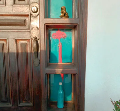 Рис. 7. Типичная венесуэльская дверь с оберегами: Цилинь, счастливый узел и бутылочка против магии. Из коллекции автора