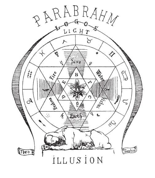 Два меньших треугольника рассказывают, скорее, о природе Человека. B, C и D обозначают Знание, Познающего и Познанное, совокупность которых образует Разум, или Сознание. E, F и G соответственно представляют собой физического человека (штула-шарира), эфирного, или внутреннего, человека (сукшма-шарира, звездное тело у Парацельса, астральное тело, кама-рупа и т. д.) и духовного человека (карана-шарира, божественный Археус, духовная Душа). В центре – божественная Атма, личный Христос, сущность, идентичная Мировому Логосу. Это – Триединство в Единстве1, оно поглощает свет, исходящий от Параматмы, и вновь излучает его, уже из центра круга. Это духовное зерно, посеянное в человеческой душе, и взрастивший его обретает вечную жизнь. Сияние же – Роза Креста, образованная Мудростью и Силой, которые связаны воедино и повелевают миром. Но ниже всего располагается область Иллюзий, наиболее плотных и грубоматериальных мыслей, что погружаются во Тьму и Смерть (Восьмая сфера, или Хаос), где разлагаются и гниют и вновь распадаются на элементы, давшие некогда жизнь Вселенной.