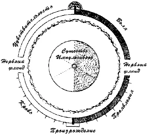 <…> Центральную часть рисунка занимает импульсивный человек, пассивно поддающийся всем побуждениям, как идущим сверху (от воли), так и снизу (от организма). Он целиком погружен в поток нервной силы, соединяющий его с разумным человеком сверху и с психическим телом снизу. В левой половине схемы расположены чувствующая и принимающая части человека, в правой же – волевая и двигательная.