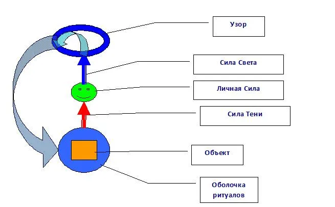 Когда Сила ТЕНИ поступает в нас извне, то есть когда мы ПОДЧИНЯМСЯ «ситуации» или другому человеку, то она соединяется с нашей Личной Силой, увеличивая ту её половину, которая находится в форме нашей собственной Силы Тени, а нарушение равновесия приводит и к увеличению Силу Света – за счет неистощимого источника Изначальной Силы, заключенного в сердцевине нашей Индивидуальности. Поскольку мы не вовлечены в действие, острие Интереса соединяется с высвободившейся Силой Света, которая направляется в сторону того Узора, который и является причиной нашего «вынужденного» действия, а это позволяет нам не только ПОЗНАТЬ его – «увидеть» образующие его линии, но и изменить их рисунок в соответствии с собственной ИНДИВИДУАЛЬНОСТЬЮ, соединить с ней эти линии. В результате изначально противостоящие нам ритуалы станут механизмом, приводящим нас к достижению НАШИХ целей, причем достигнуть мы их можем почти безо всяких усилий, по ВОЛШЕБСТВУ.