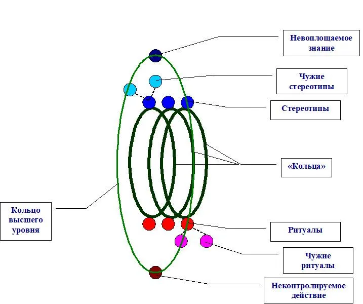 Собственно говоря, такого рода «кольца» создаются сами собой – дело только в достаточном количестве энергии. В обычном случае вся наша энергия расходуется на поддержание уже заложенных в нас ритуалов и стереотипов – тех «колец», которые привязывают нас к внешнему миру. Но если мы «затормозим их вращение» – уйдем в ашрам или в монастырь и сделаем это ИСКРЕННЕ, – то часть энергии будет накапливаться внутри нас и через какое-то время её может оказаться достаточно для того, чтобы соединиться с одним из высших Узоров и стать его проводником в проявленный мир. Например, чтобы превратить абстрактное знание о «недопустимости насилия» в изменение структур нашего тела, определяющих «агрессивное» отношение к миру. В том числе трансформировать механизмы выработки адреналина в выработку эндоморфинов, вернее, изменить потоки энергии, которые и определяют эти процессы. Это и означает установление контроля за теми «образами действия», которые мы раньше не могли контролировать, а тот факт, что «контроль» принадлежит не нам, обычно никого не волнует. Главное, что мы научились обретать форму, недоступную другим людям и наше отличие видимо для всех.