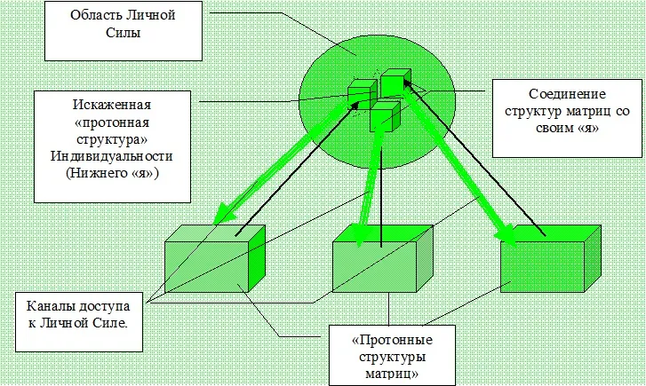 Мы уже говорили о том, что наша способность непосредственно воспринимать «протонную структуру» Матриц играет с нами злую шутку. Она формируется раньше, чем наша собственная структура – «нижнее я», поэтому отображаемые нами голограммы оказываются в самом центре нашей КМ. А поскольку мы всегда претендуем на центральное место, то единственный способ сохранить, хотя иллюзию этого – соединиться с уже вложенными в нас «голограммами» – правилами Матриц. Это приводит не только к нашей зависимости от этих правил – они тоже меняются, частично отображая нашу Индивидуальность. А значит, и меняются и связанные с ними «протонные структуры» матриц, которые тоже оказываются искажены по сравнению с соответствующими им ОМ – то есть обретают какую-то самостоятельность и независимость.