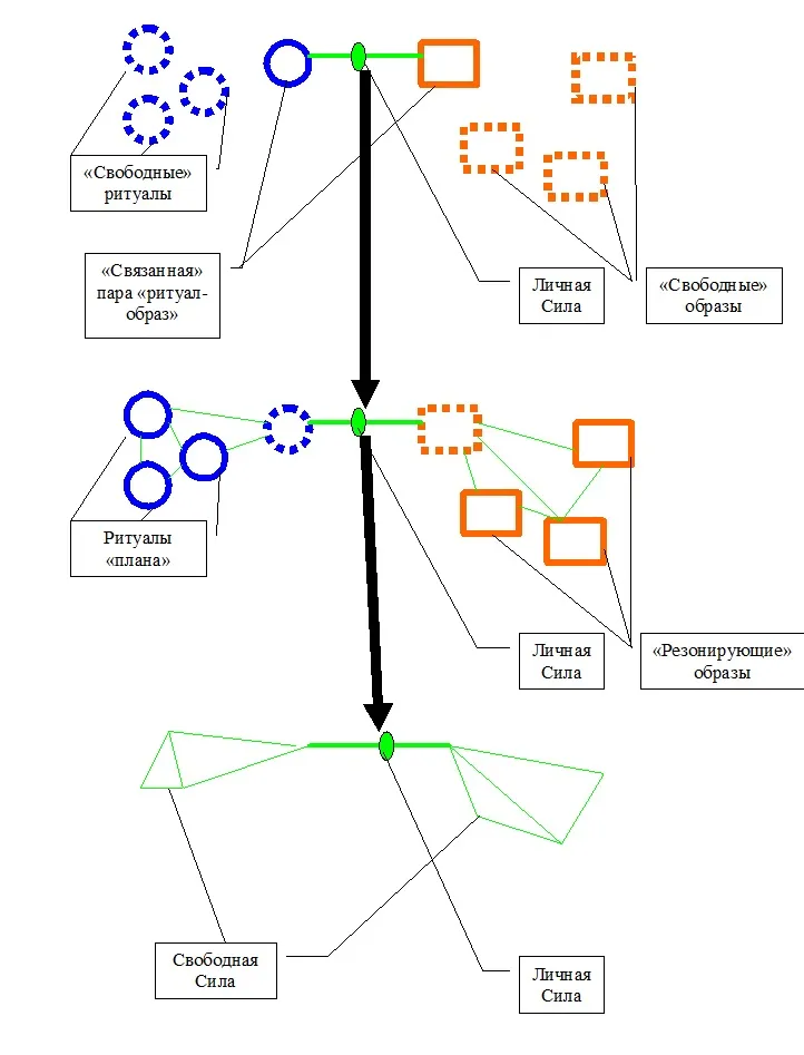 Наконец, возможен и третий вариант, открывающий путь к Магии и Волшебству нашего мира. Есть связи, соединяющие образы Картины Мира воедино – они образованы Силой Оранжевого Дракона, и есть связи, соединяющие элементы Описания Мира, образованные Силой Голубого Дракона. Пока эти Силы связаны с конкретными элементами, они отделены от нас и противостоят нам. Но если мы как бы растворим элементы, сосредоточимся на самих связях, то Сила окажется на нашей стороне, что позволит менять мир «магическим» или «волшебным» способом.