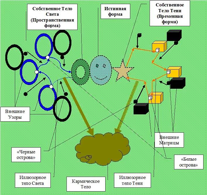 Всё дело в движении Времени. Когда мы связаны с первой группой линий, погружены в «пленку обыденности», то, как бы отстаем от общего потока – мир для нас образован, в основном «черными островами», к которым мы приближаться не хотим и всячески препятствуем процессам такого сближения. А это «отставание» делает нас абсолютно зависимыми – мы хотя и «плывем медленнее», но точно следуем установленному маршруту, одновременно усиливая увлекающий нас Узор – пловец, пытающийся плыть против течения, всегда немного увеличивает его скорость. И главное, отставая от Времени, мы как бы «расширяемся» в Пространстве – единственный способ «замедлить движение» – «зацепиться» за что-нибудь, в первую очередь – за свою «собственность». Создать «вещественное тело» – приобретательство и собирательство главная черта «отстающих от времени». Равно как и жадность и все связанные с нею чувства – это тоже точный индикатор. Понятно, что при этом наше тело Тени становится слишком тонким для того, чтобы воздействовать на объекты внешнего мира – поэтому в такой форме человек оказывается почти беспомощным не только в будущем, но и в настоящем – у него просто нет свободной Силы, которая могла бы присоединить к нему что-то новое. Конечно, и в этой форме есть «белые острова» – «черные острова» не могут существовать без них, но они оказываются недосягаемыми – можно мечтать о «миллионах», но эти мечты не будут соприкасаться с видимым миром – в нем нет вариантов «мгновенного обогащения». Поэтому «отставание от Времени» и «растворение в Пространстве» становятся главными способами существования человека – в первой форме его кармического тела.