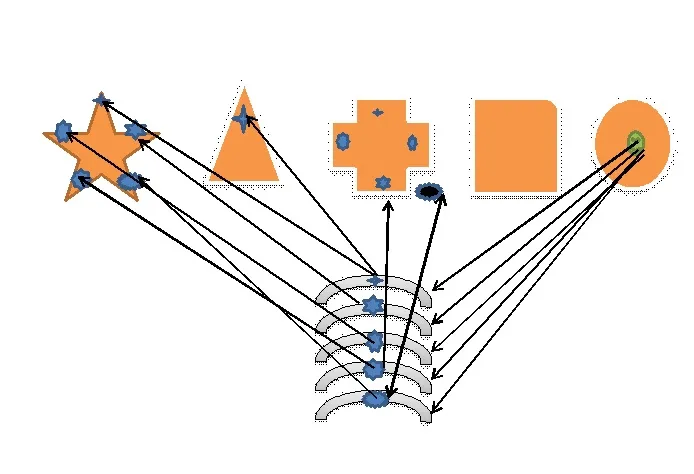Фигуры наверху – формы, которые мы можем принимать. Дуги внизу – Узоры, с которыми мы можем соединиться. «Звездочки» в звездах и фигурах – резонансные вибрации соответствующих форм и Узоров. Если они совпадают по форме и по размеру соединиться с Узором очень легко. Так происходит, когда мы обладаем совершенной человеческой формой – на схеме она отображена пентаграммой.