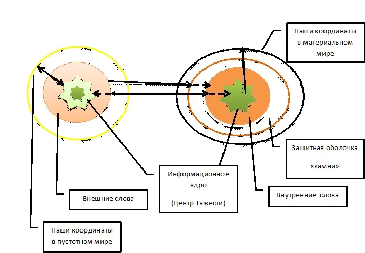 Верхний (на схеме левый) «центр тяжести» связан с образом «я», с описанием самого себя. Он окружен оболочкой «внешних слов», изменяя которые мы можем изменять образ «я» и, соответственно – наши координаты в пустотном мире. Например, мы можем принять решение сменить работу, место жительство и так далее – соответственно изменится и наше представление о том мире, в котором мы будем жить. Но и здесь наши возможности парадоксальным образом ограничены. Внешние слова мы можем изменять произвольно – несложно, например, сказать себе, что следующие три дня мы ничего не будем есть. Но при этом большинство начнут сомневаться в «правдивости» этих слов уже в момент их произнесения. На самом деле они прозвучат так «…МОЖЕТ БЫТЬ, я не буду ничего есть в течении следующих трех дней…» И будут сопровождаться неслышимым эхом «…а может быть и буду…». При этом мы знаем, чувствуем, что все зависит не только от наших слов и мыслей – есть что-то ещё, что может нас заставить отказаться от них. Вернее, действовать вопреки им.