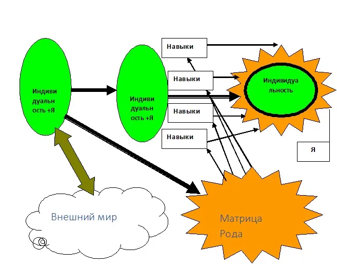 Разумеется, какие-то каналы доступа к ИНДИВИДУАЛЬНОСТИ остаются, но они носят односторонний характер. Мы в основном извлекаем из неё энергию, которую преобразуем в свое внешнее «я». Создаем вокруг своей индивидуальности иную форму, подчиняющую нас внешним структурам и соединяем её с собой так, чтобы вся энергия впечатлений, которую мы получаем из внешнего мира, накапливалась именно в этой форме, а после её распада доставалась той структуре, частью которой она является – что-то Богу, что-то Жизни, что-то Роду, а что-то Паразиту.