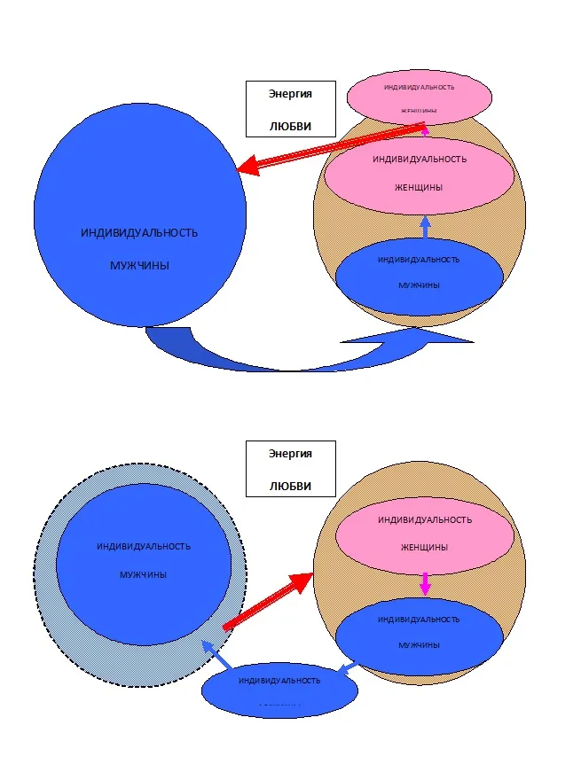 Конечно, это крайние варианты. Обычно все процессы протекают где-то посередине, превращаясь во что-то вроде «перетягивания каната». А если учесть тот факт, что человек обладает способностью восстанавливать свою ИНДИВИДУАЛЬНОСТЬ, например – в процессах карьерного роста или «легкого флирта», то процессы взаимного разрушения могут продолжаться очень долго – до самой смерти. В данном случае мы имеем дело с тем, что называют «счастливой семьей». Но все-таки это скорее исключение из правил – обычно дело заканчивается формированием «внутренних границ», позволяющих каждому относительно безопасно существовать на совместной территории. Безопасно – но и без ЛЮБВИ, просто при этом нет никаких источников, откуда можно было бы брать эту энергию.