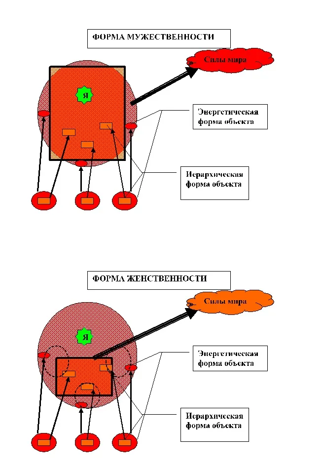 Но это происходит достаточно редко. Наш мир – мир МАТРИЦ, и условием его существование является ослабление потока ЖИЗНИ до почти нулевых значений. А механизм прост – подавление ЖЕНСТВЕННОСТИ, расщепление её изнутри. ЖЕНСТВЕННОСТЬ отображает в себе не только энергетическую форму объекта, но и его иерархическую форму. Более того, иерархическая форма является определяющей во всех процессах отображения мира. Например, для женщины, занявшей какое-то место в иерархии, симпатичный начальник или коллега воспринимается совсем по-другому, чем симпатичный уборщик – в громадном большинстве на уборщика она просто не обратит внимания. Главной для неё остается именно энергетическая форма, определяющая ПРИВЛЕКАТЕЛЬНОСТЬ другого человека, но эта форма настолько плотно связана с иерархической формой, с формой МУЖЕСТВЕННОСТИ, что она не может отделить одно от другого. А между ними всегда есть противоречие – МУЖЕСТВЕННОСТЬ в своей завершенной форме почти бесчувственна, лишена внутренней энергетики, а значит НЕПРИВЛЕКАТЕЛЬНА. Поэтому ЖЕНСТВЕННОСТЬ вынуждена наполнять структуру МАТРИЦЫ своей собственной энергией, направляя поток ЖИЗНИ на те объекты, которые занимают в ней верхние позиции, и как бы оживляя их. Тот запрет на изменение формы, о котором мы говорили раньше, в данном случае проявляется как запрет на разделение иерархической и энергетической формы.