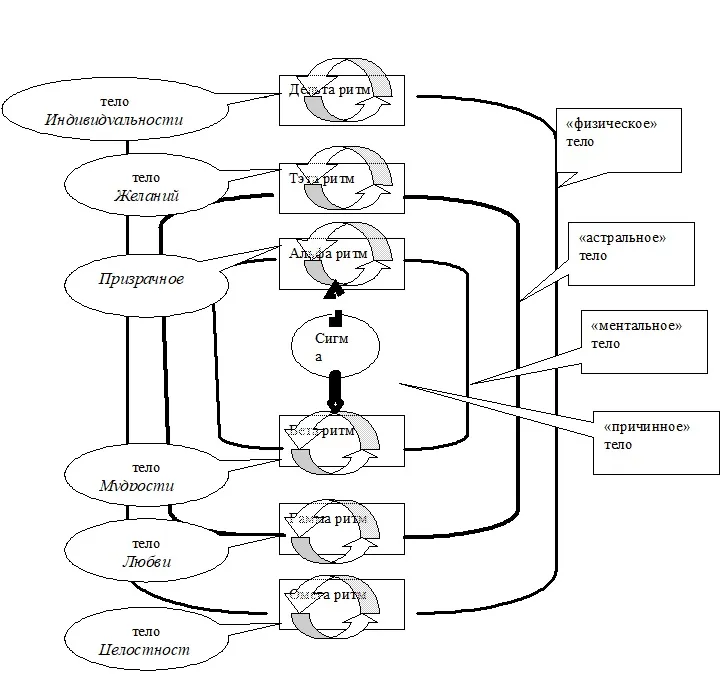 Формирование каждого из «бессмертных» тел связано с разрывом связей, образующих структуру большого тела человека. Обретение тела