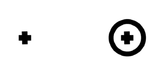 Вот схема, которую мы уже использовали раньше. Закройте правый глаз и левым глазом посмотрите на правый крестик, который обведён кружочком. Держите лицо и монитор вертикально. Не сводя взгляда с правого крестика, приближайте (или отдаляйте) лицо от монитора и одновременно следите за левым крестиком (не переводя на него взгляд). В определённый момент он исчезнет.