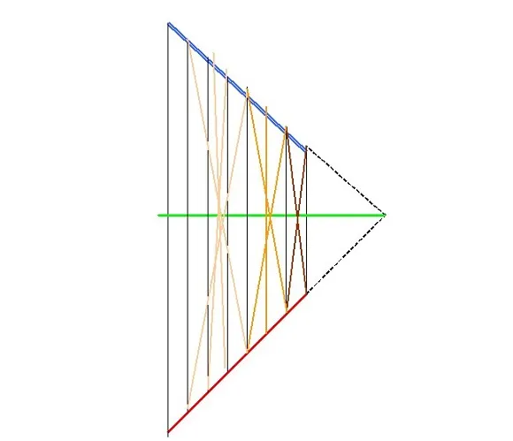 Структура нашего мира – МИРА ЦЕЛОСТНОСТИ делиться на семь основных уровней. Я уже говорил о квантах времени и пространства и о том, что нет никакой возможности существовать между ними. Число этих пространственно-временных форм на уровне пределов реальности равно семи и между ними нет ничего. Иначе говоря, всё сущее может пребывать в реальности только в соприкосновении с одной из семи точек сверху и с одной из семи точек снизу. То есть структуру четвёртого мира графически можно изобразить следующим образом:
