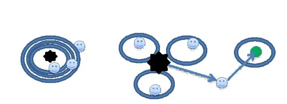 Здесь все ясно – черные восьмиугольники – отношения Иерархии (равенства) – слева – в достаточно сложном Узоре типа Узора власти. Посередине – при создании и реализации собственных Узоров – здесь они возникают при сравнении нашего «дома» и «дома» соседей. А правый вариант – использование энергии аккумулятора Иерархии для создания Солитона – который в дальнейшем будет раскручивать Узор сам.