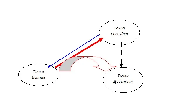 Мы сохраняем способность действовать, но все наши действия в большей степени подчиняются другому, то есть все, что мы делаем, мы делаем с оглядкой на него. А это разрушает связи, соединяющие точку РАССУДКА с точкой ДЕЙСТВИЯ, делая невозможным формирование первого, МАГИЧЕСКОГО кольца.