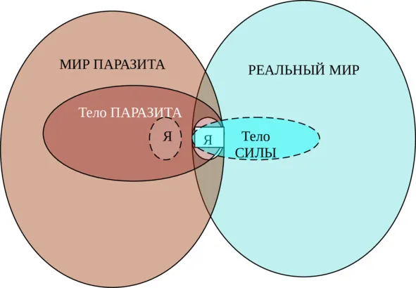 Другое дело ПАРАЗИТ, который не существует помимо нас и поэтому – полностью зависит от нас. Он существует до тех пор, пока все наши силы – лишь «образы» в сознании других людей. Стоит нам обрести реальную Силу – Силу непосредственного воздействия на мир – как ПАРАЗИТ, БУФЕРНАЯ ЗОНА разрушится мгновенно. И наоборот – стоит нам избавиться от власти ПАРАЗИТА, разрушить БУФЕРНУЮ ЗОНУ, как мы обретём все силы, которые представлялись нам недостижимыми.