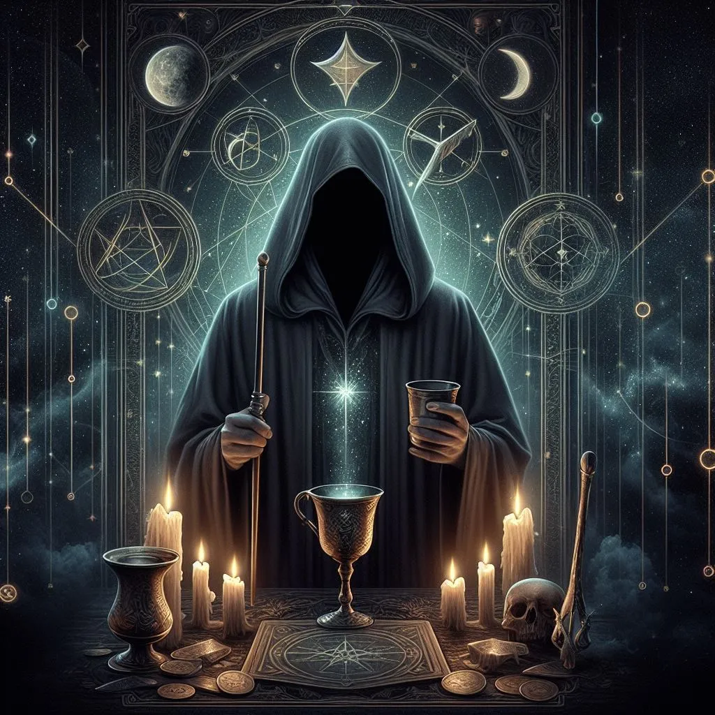Карта Таро «Маг» изображает фигуру мага, стоящего перед алтарем или столом. Он держит в руках волшебные атрибуты: жезл, чашу, меч и пентакль, представляющие четыре элемента и аспекты человеческого опыта. Над его головой висит бесконечный знак, символизирующий бесконечные возможности и связь между миром небес и земли.