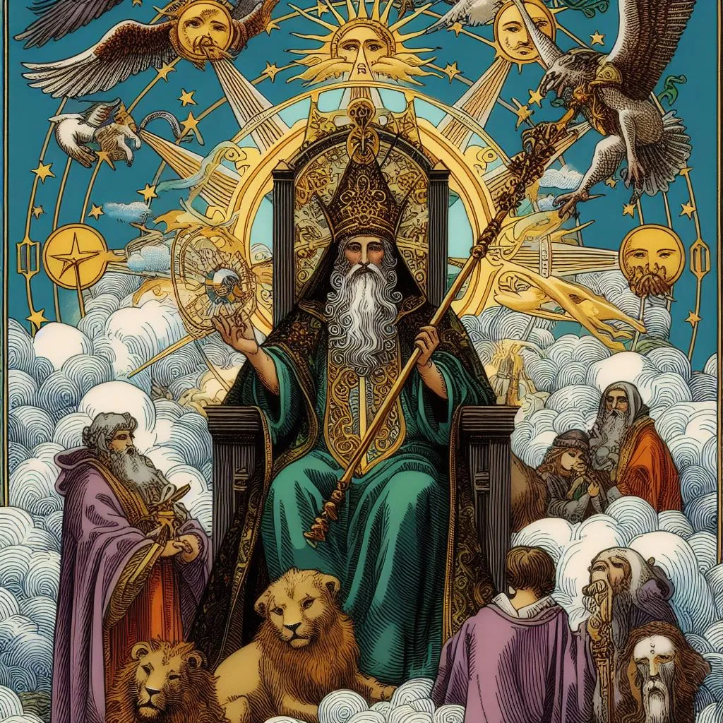 Карта Таро «Иерофант» изображает мужчину, часто духовного лидера или священника, сидящего на троне перед двумя учениками или последователями. Он может держать в руке символы религии или духовности, такие как папская тиара, палочка или священная книга. За ним обычно виднеется храм или священное место, символизирующее духовные знания и мудрость.