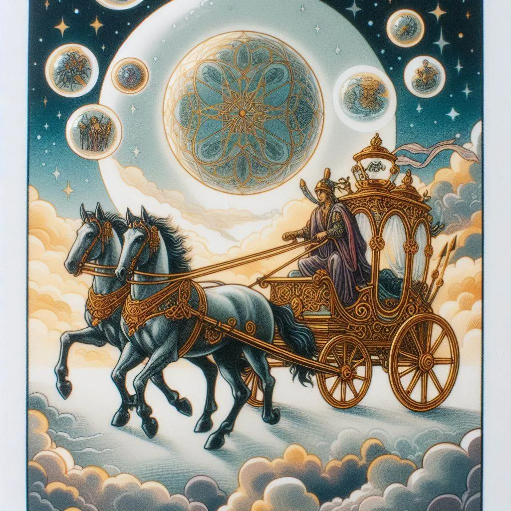 Карта Таро «Колесница» изображает колесницу, обычно тянутую парой лошадей или другими животными, а также воином или владельцем, стоящим или сидящим в колеснице. Обычно колесница представлена движущейся вперед, часто она изображается сферическими колесами, символизирующими бесконечный цикл жизни и судьбы.